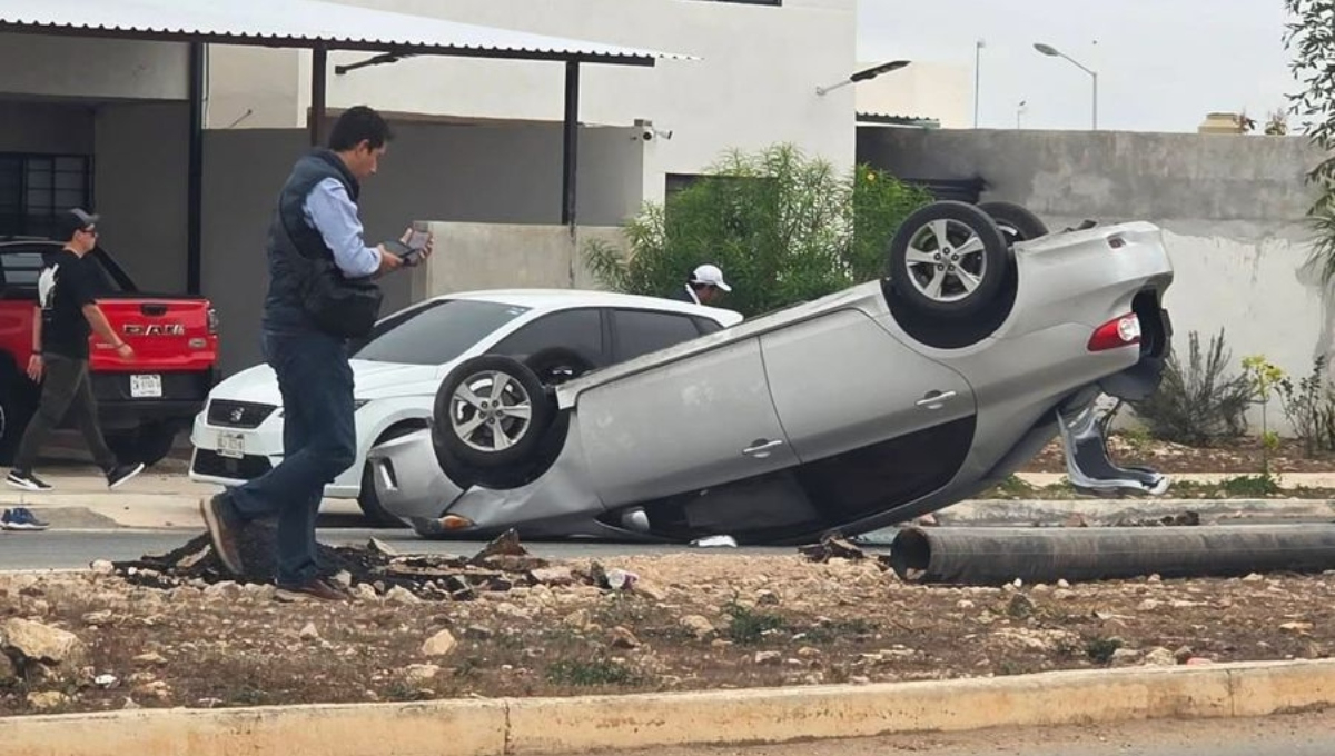 Un aparatoso accidente vehicular se registró la mañana de este jueves en el fraccionamiento Los Héroes, al oriente de Mérida, donde un automóvil terminó volcado tras impactar contra una unidad estacionada, generando movilización policiaca en la zona.