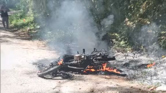 Una motocicleta quedó calcinada en el tramo Peto-Chacsinkín tras derrapar al esquivar a un perro. Los ocupantes resultaron ilesos y la Policía Municipal sofocó el fuego antes de que se propagara.