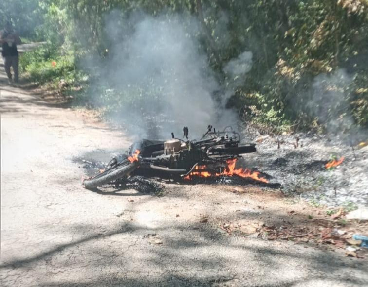 Una motocicleta quedó completamente calcinada la tarde de ayer sobre el tramo carretero Peto-Chacsinkín, luego de que sus ocupantes derraparan al intentar esquivar a un perro.